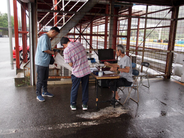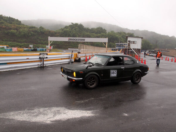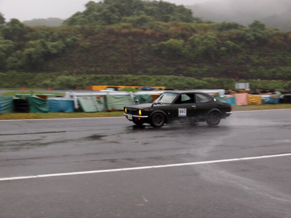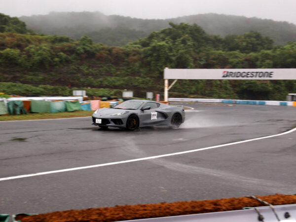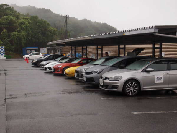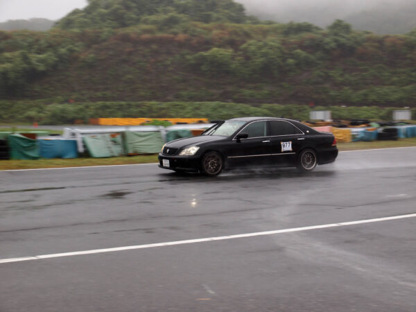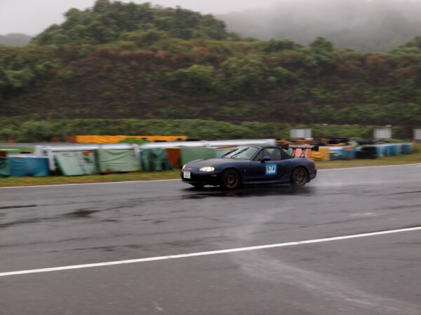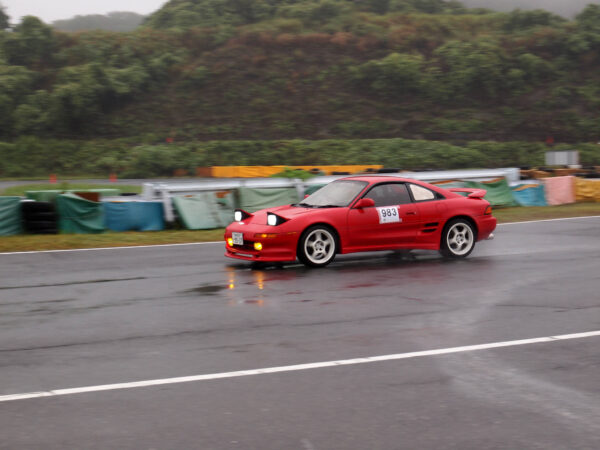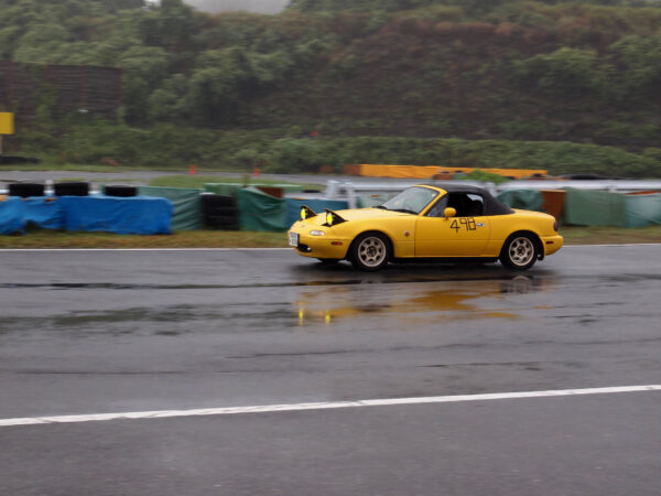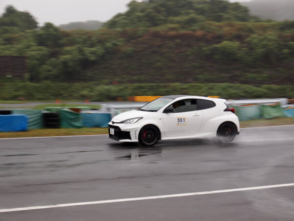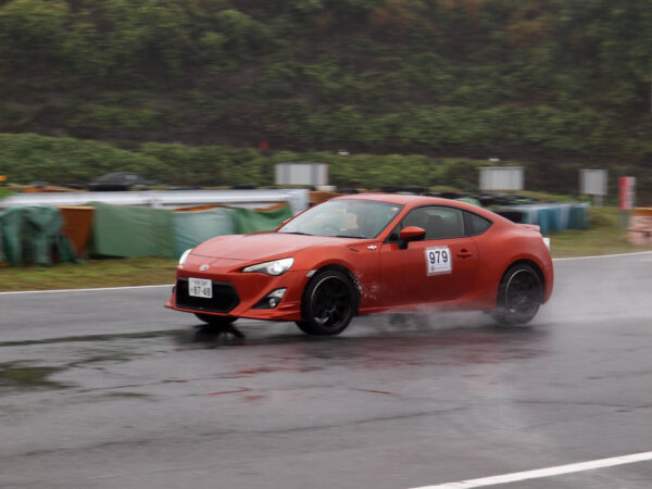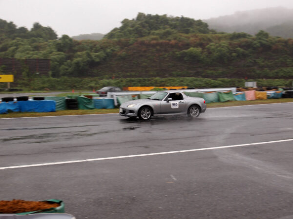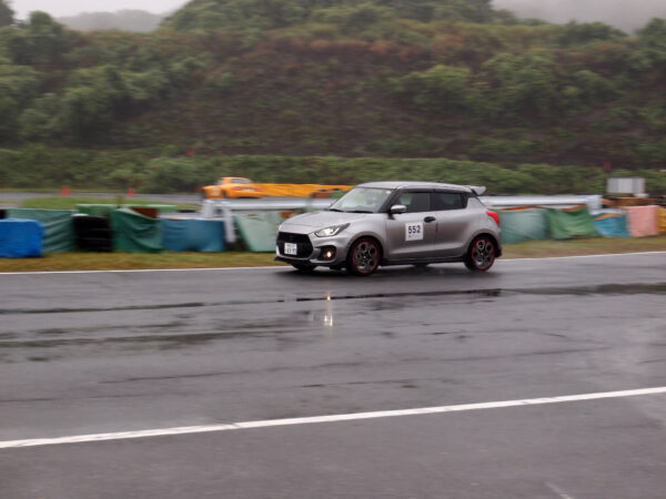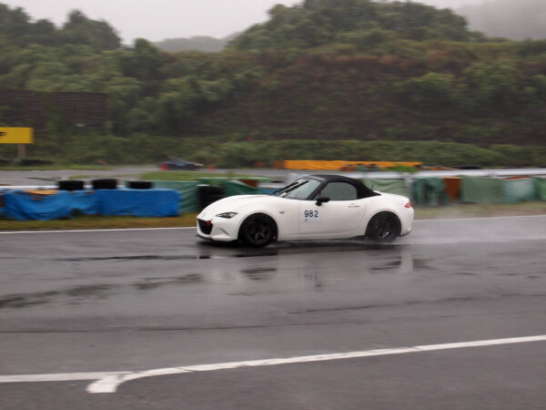 あいにくの小雨が降り続く中ではありますが、 ウェット状態のコースで前後タイヤのグリップを細心の操作でバラ ンスさせ車両姿勢をコントロールするという絶好の練習機会となり 、 参加者の皆さんはそれぞれラップタイムを徐々に向上させ自信につ なげていただけたようです。