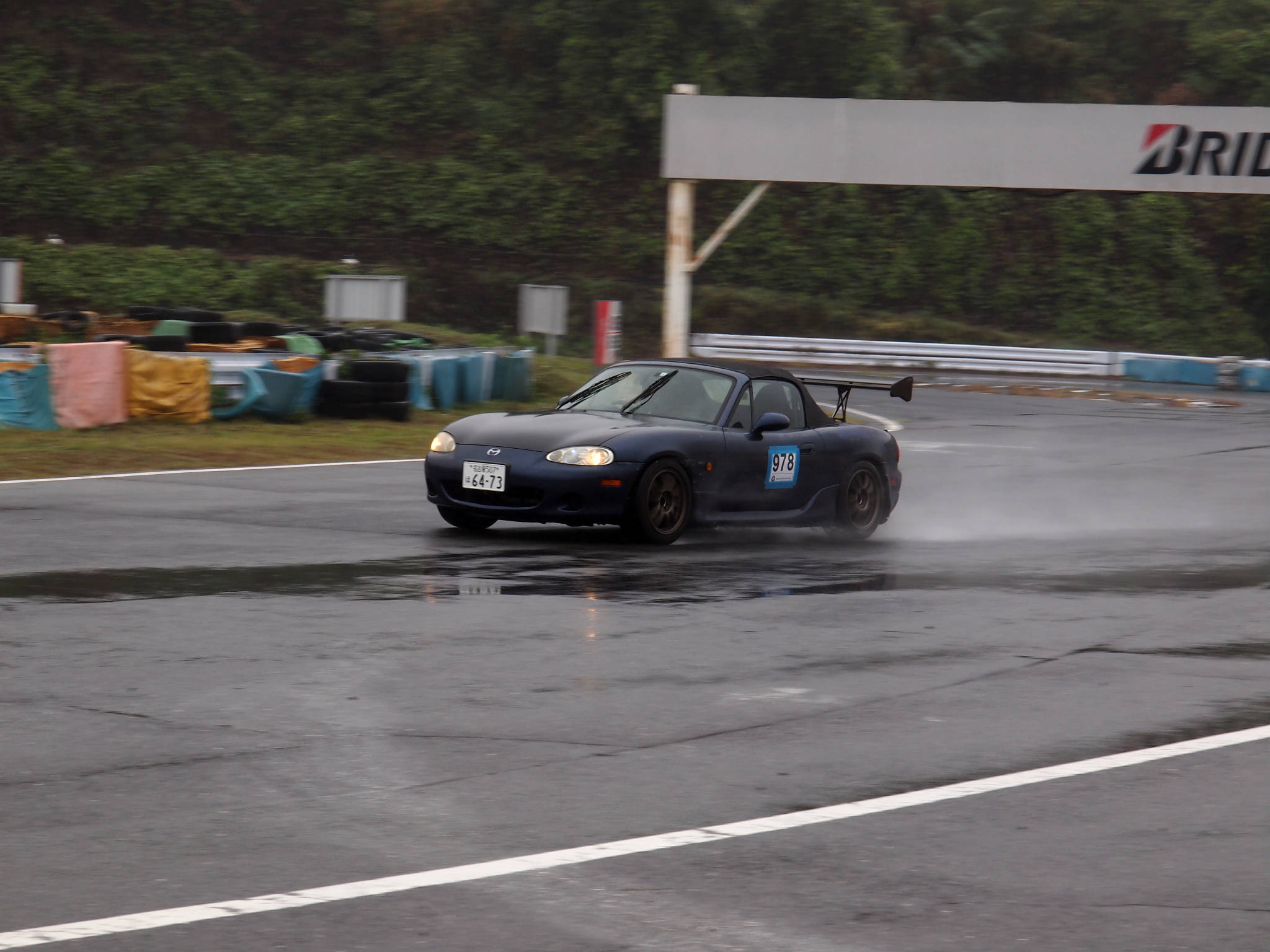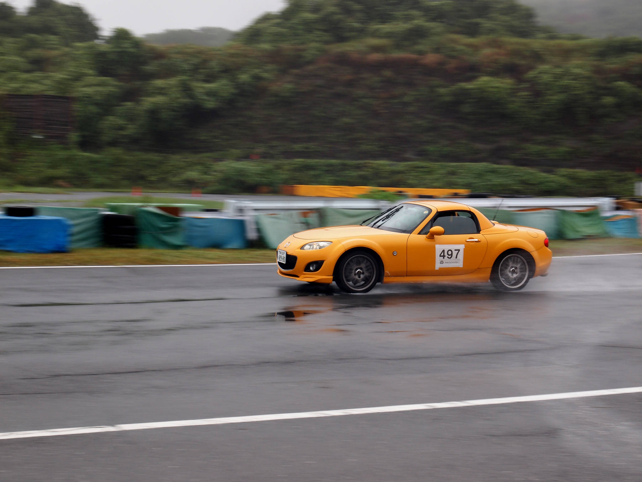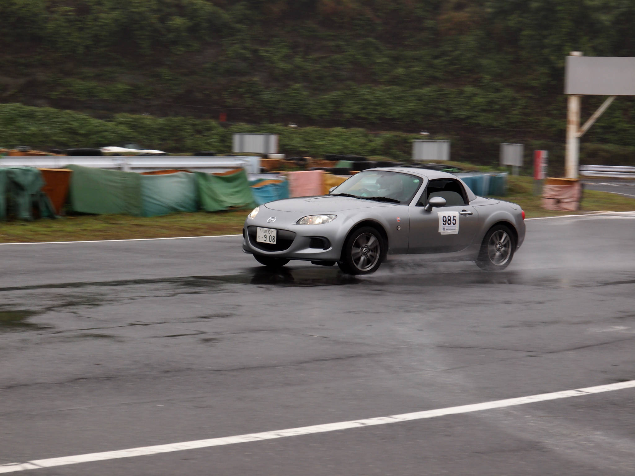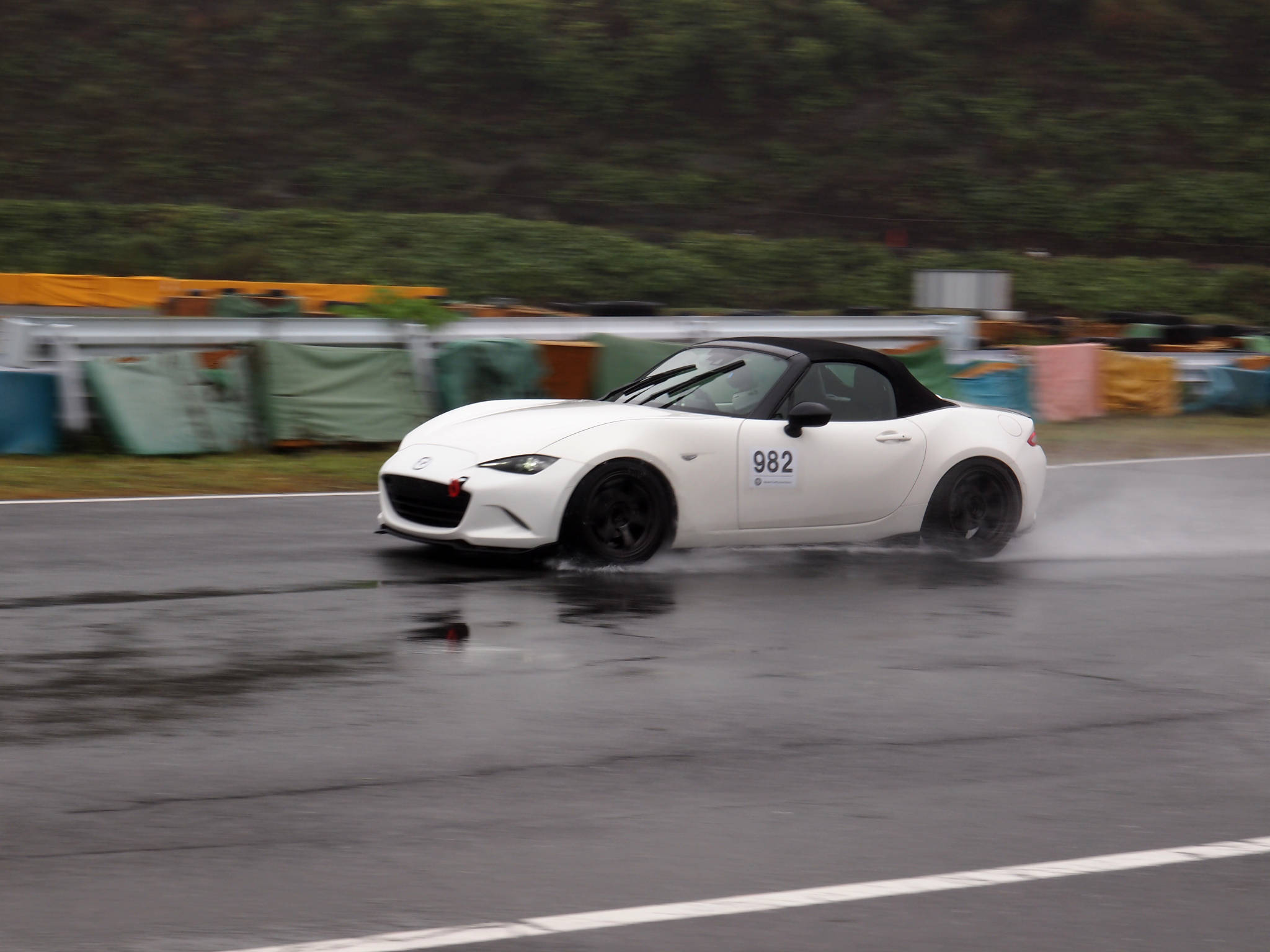あいにくの小雨が降り続く中ではありますが、 ウェット状態のコースで前後タイヤのグリップを細心の操作でバラ ンスさせ車両姿勢をコントロールするという絶好の練習機会となり 、 参加者の皆さんはそれぞれラップタイムを徐々に向上させ自信につ なげていただけたようです。