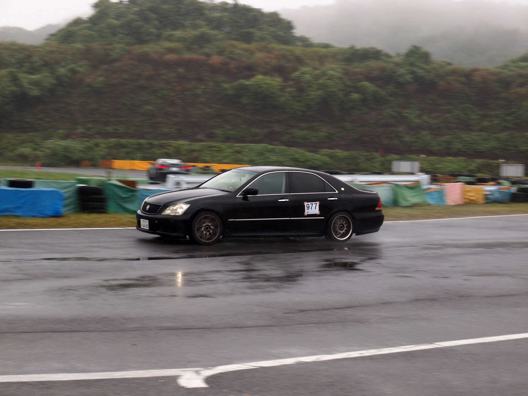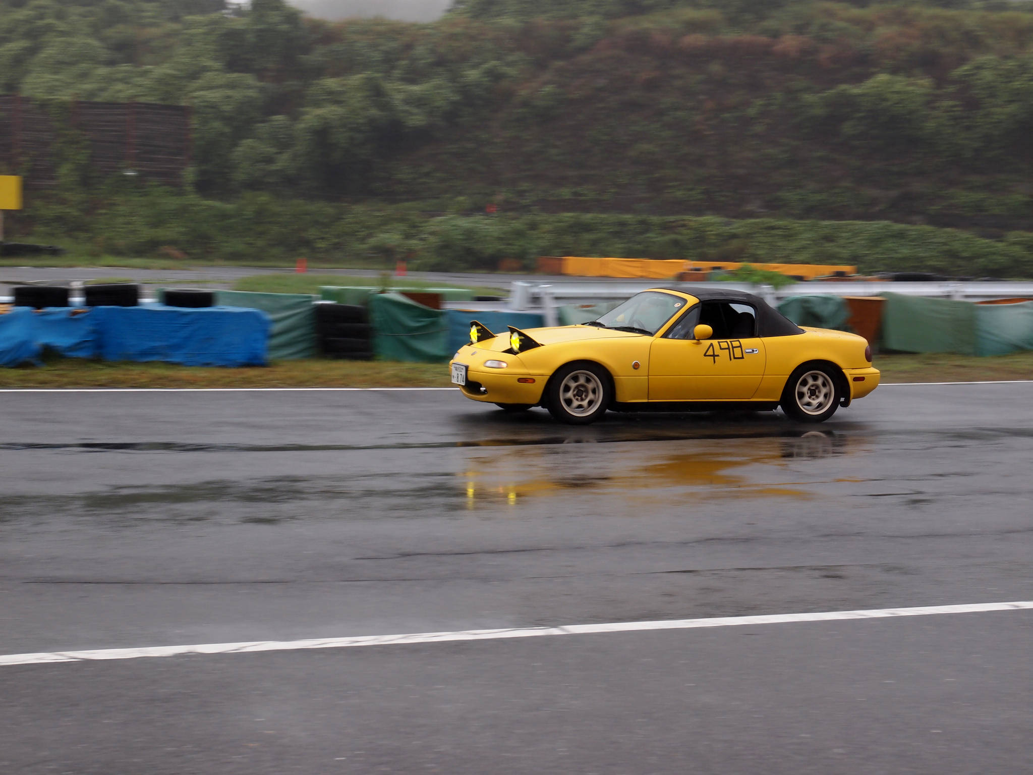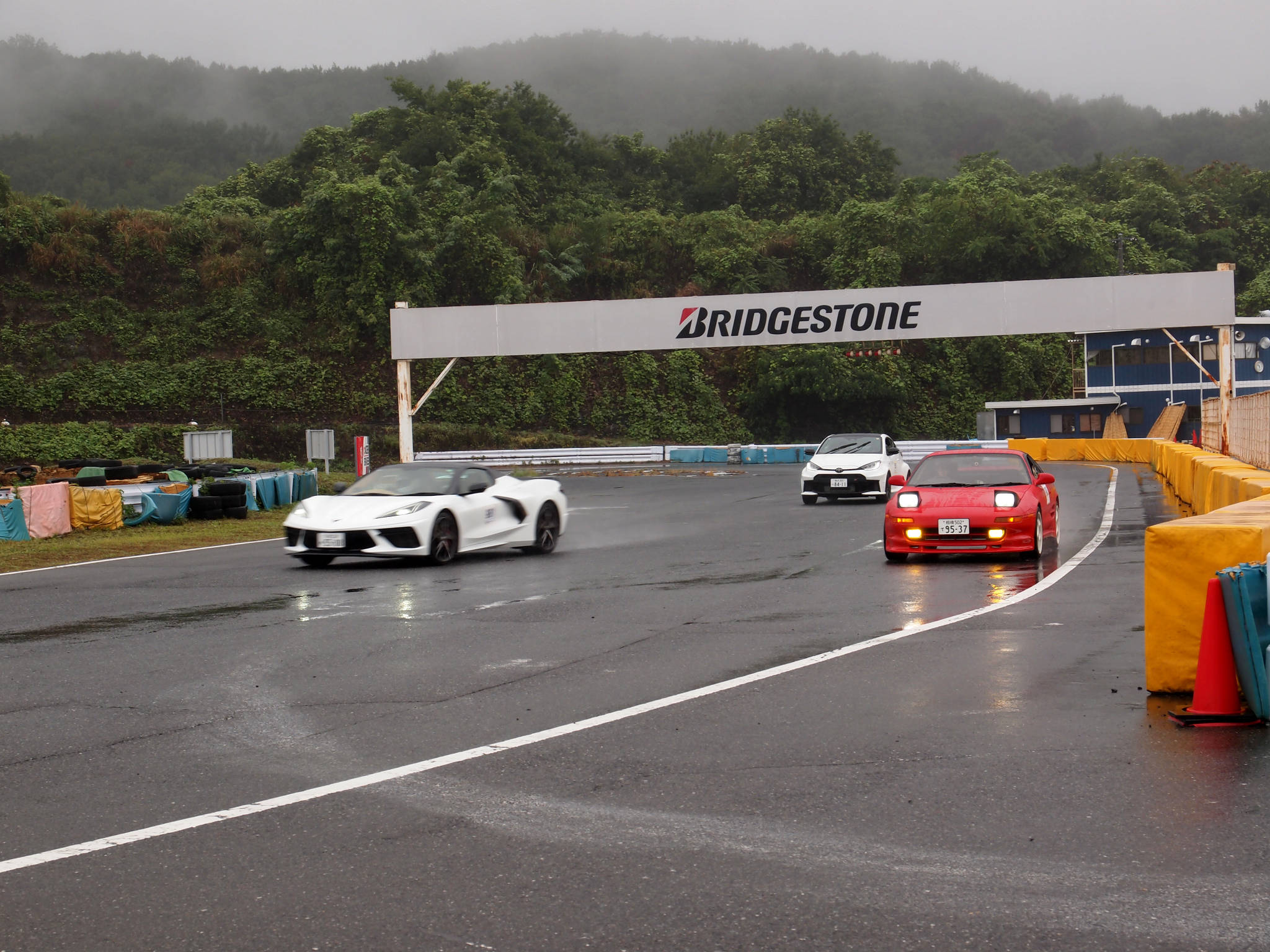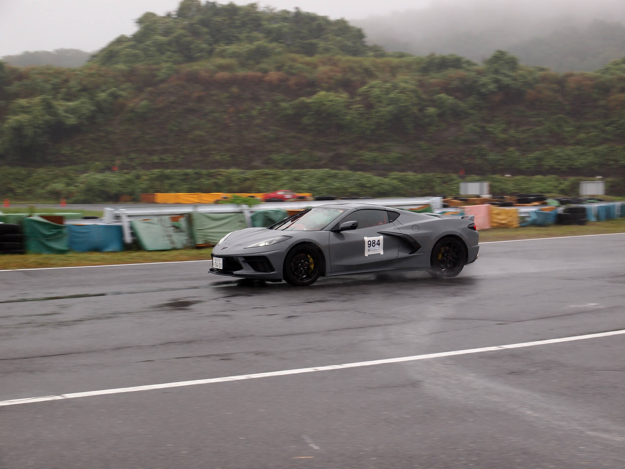 あいにくの小雨が降り続く中ではありますが、 ウェット状態のコースで前後タイヤのグリップを細心の操作でバラ ンスさせ車両姿勢をコントロールするという絶好の練習機会となり 、 参加者の皆さんはそれぞれラップタイムを徐々に向上させ自信につ なげていただけたようです。